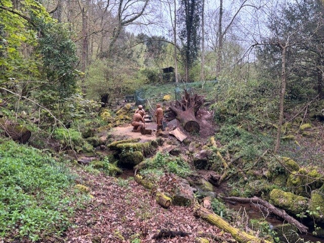 - As you descend, look out for the wood carvings on the left in the trees, depicting men working on the creation of a milling wheel. Fabulous.