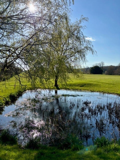 - As the path approaches a pond you'll see it bears left into woodland, away from the course. A signpost soon guides you to the right, back towards the course.