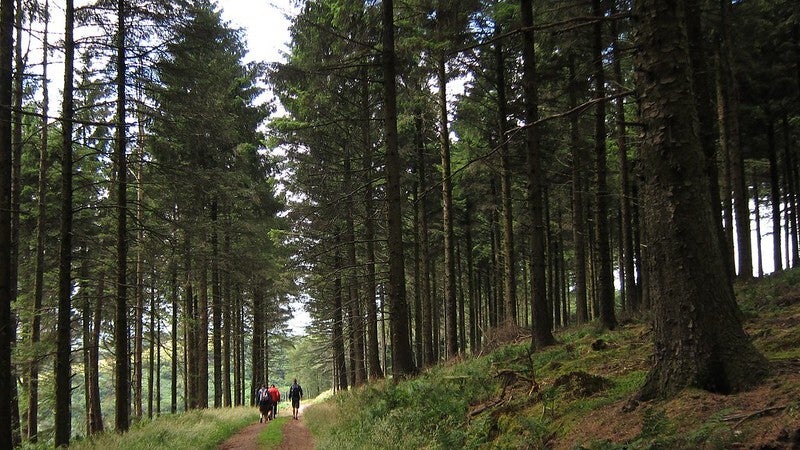 - The path rises steeply, rounding to the right into woodland, then onto a broader wooded track at the top. Bear left here. There’s evidence of forestry work around so pay heed to any warning signs and be prepared to adjust your route if needed.