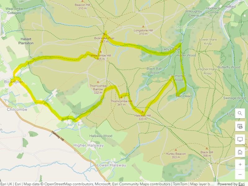 - Follow this lane until you reach the first footpath downhill to the left (there’s a metal kissing gate into a field immediately opposite). Turn left down this footpath, which is Mapleton Lane. Leaving woodland and onto a grassy track with fields either side, this eventually joins the tarmacked Pylewell Lane at a farm outbuilding. Follow it up to the A38.